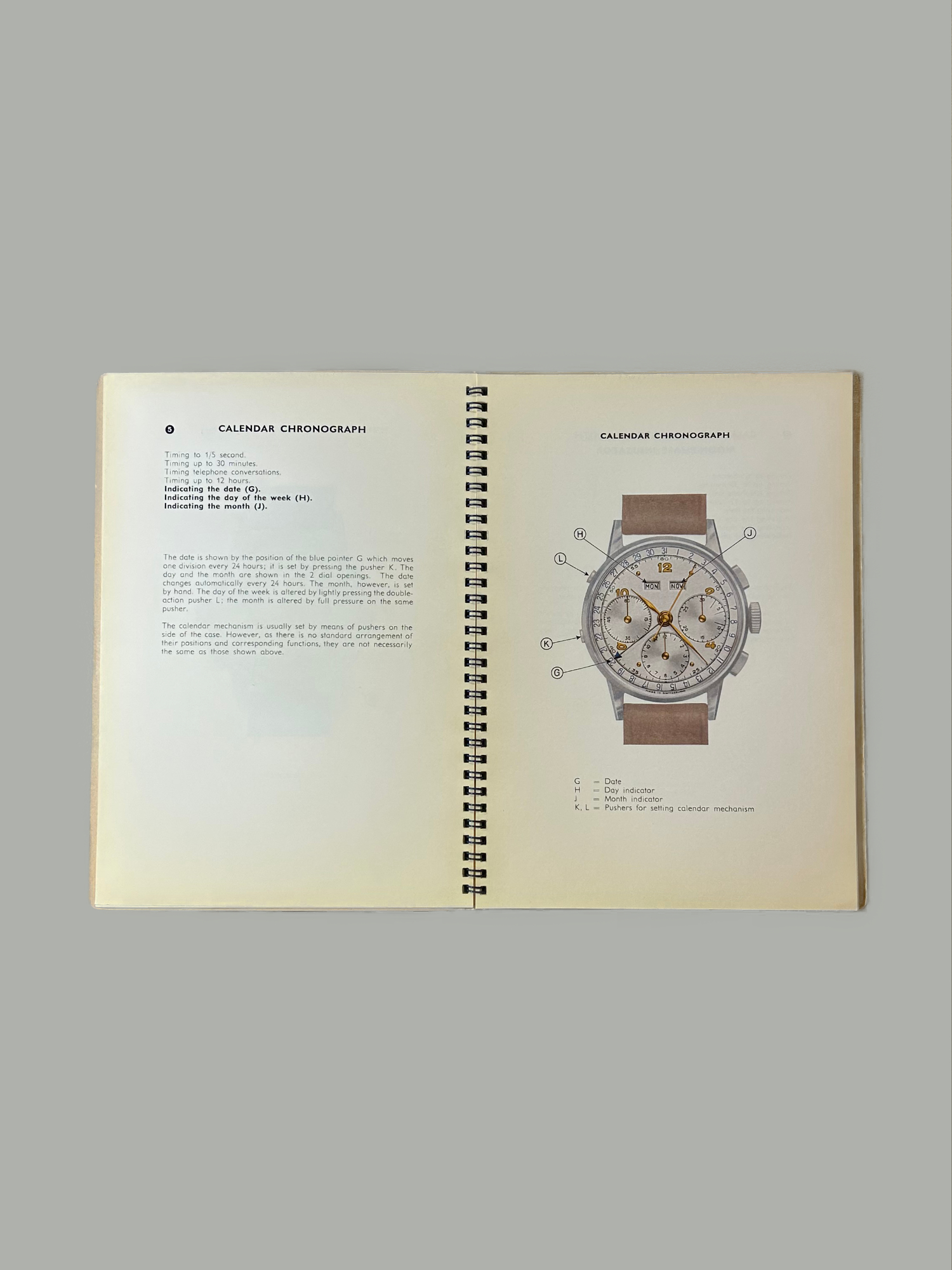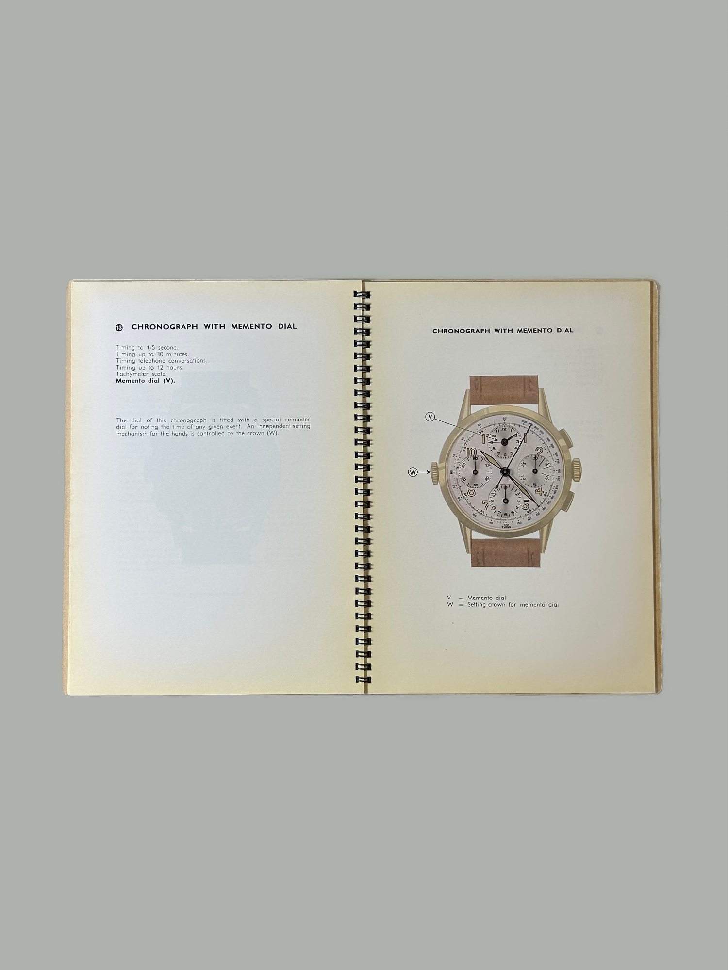 A rare mid-century booklet published by The Watchmakers of Switzerland, explaining the functional language of chronograph dials. Available in various original editions (1951–1958), subject to availability.