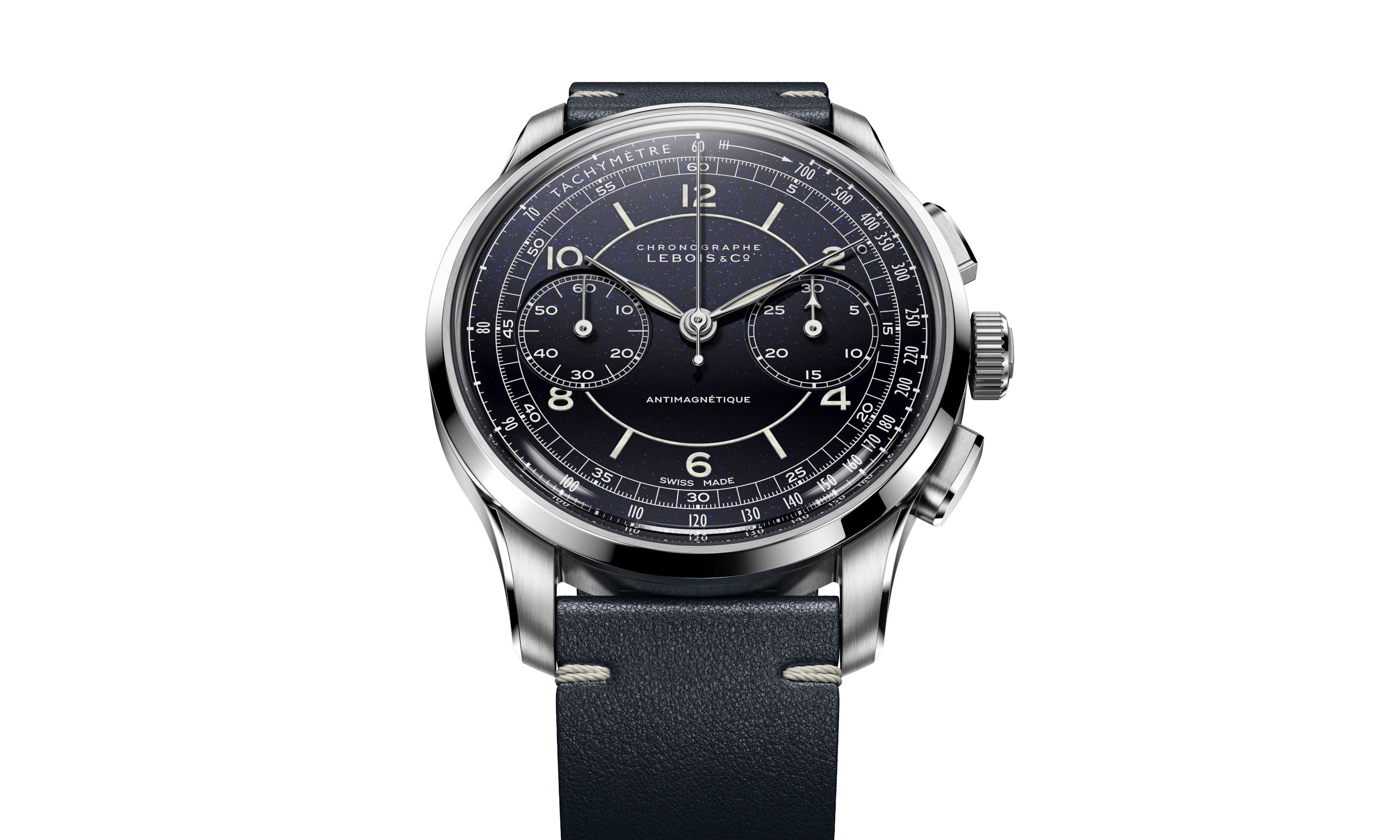 The Heritage Sector Chronograph Aventurine pairs classic chronograph architecture with a dial that feels alive. Its aventurine dial—deep blue glass filled with countless shimmering particles—catches light like a night sky, shifting from subtle sparkle to a full “starfield” with every movement of the wrist.